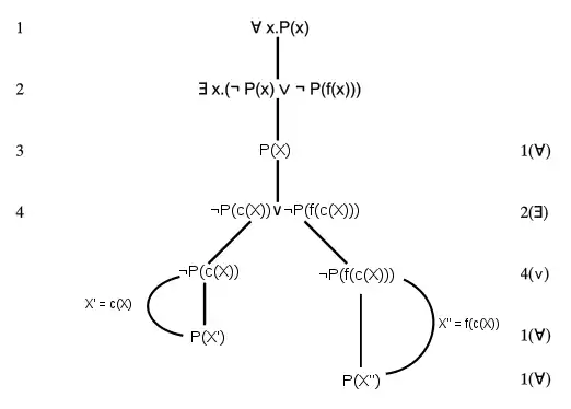 Pour les formules de type , on utilise la skolémisation : on remplace par une constante fraîche dans et on l'ajoute à la branche.