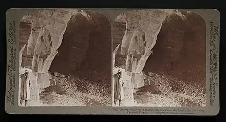 Les roches se présentent sous la forme de filons ou bancs horizontaux. Les méthodes de travail de ces carriers sont assez limitées voire primitives, on choisit des blocs détachés qui ont la taille désirée et on les extrait à l’aide de traineaux tirés par la plus grande partie des hommes de l’expédition. On peut également détacher les blocs en faisant des entailles ou l’on enfonce des morceaux de bois que l’on mouille jusqu’à ce qu’ils gonflent et fassent éclater la roche.