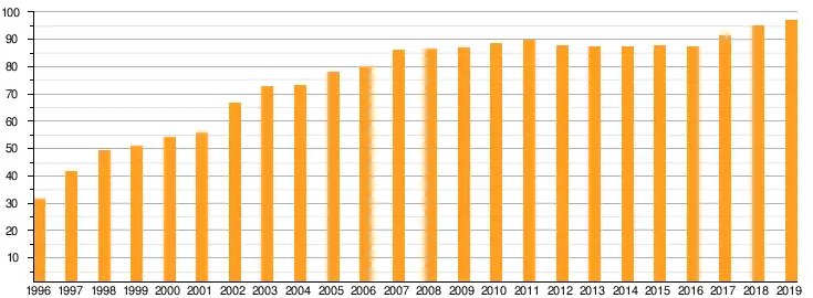 Finalement la mise en service sera effective le 11 novembre 1995[12]. Sa fréquentation prévue est alors de 30 millions de passagers par an[13], mais elle dépassera rapidement toutes les prévisions initiales[14].