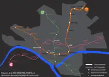 En , les deux partis au pouvoir au conseil municipal de Séville passent un accord pour relancer le projet du réseau métropolitain[2]. Adopté en , le plan de base du réseau l'organise autour de quatre lignes : la ligne 1, circulant d'ouest en est entre Los Remedios et le campus de l'université Pablo de Olavide en passant par la gare de San Bernardo ; la ligne 2, circulant d'ouest en est entre Plaza de Armas et le quartier de Torreblanca en passant par la gare de Santa Justa ; la ligne 3, circulant du nord au sud entre le quartier de Pino Montano et le quartier de Los Bermejales en passant par le Prado de San Sebastián ; et la ligne 4, suivant un tracé circulaire desservant notamment Triana et La Cartuja[5]. Le conseil de gouvernement du approuve le plan d'ensemble du réseau, ainsi que deux prolongements de la ligne 1 : à San Juan de Aznalfarache et Mairena del Aljarafe à l'ouest, et à Dos Hermanas à l'est[6]. Le réseau, dont la date d'achèvement est prévue en , a une projection de 91 millions de voyages par an sur 52,5 km de trajet et 75 stations[6].