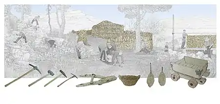 • la barre à mine, les coins en fer et la masse du carrier — la barre à mine pour déliter les affleurements de roche tendre et en extraire des blocs, les coins en fer pour extraire et fractionner des blocs de roche dure, la masse pour frapper les coins dans les emboîtures mais aussi pour briser les blocs trop lourds à soulever[3],