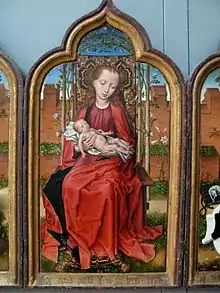 L'indication d'une date aussi précise que celle du peut signifier que le triptyque était créé pour une occasion particulière, probablement le mariage des donateurs. Le triptyque montre des parentés stylistiques avec l’œuvre de Rogier van der Weyden et Hans Memling. L’unité du cadre est préservée à travers les trois panneaux en plaçant les personnes à l’intérieur d’un jardin clos (Hortus conclusus) entouré de murs crénelés. Des portails surmontés des blasons s'ouvrent sur un extérieur arboré. Autour de la Vierge poussent roses, le lys, le fraisier sauvage. Dans les volets latéraux, il y a pissenlits, pensées, violettes, soucis[3]. Friedländer, cité par Campbell 2009, considère que « l’artiste était un contemporain remarquable de Memling, peut-être un élève de van der Weyden ». L’influence de Dieric Bouts l’Ancien a aussi été suggérée. Maria Hoose est vêtue en Flamande. Elle porte un court hennin tronqué, appelé coiffe bourguignonne, richement décoré de perles ; un voile transparent attaché retombe sur le dos. Un long voile encadre son visage et tombe le long du dos. Les cheveux sont à peine visibles, et épilés sur le front pour relever la chevelure, selon la mode alors en vogue dans toute l'Europe. Maria porte un lourd collier. La robe noire est frangée de fourrure autour de l'ample décolleté, sur les bords des manches et du bas. Une large ceinture rouge enserre la robe. Elle porte trois bagues à la main gauche. Devant elle, posé sur un petit sac noir avec une bandelette rouge, un chien de compagnie. Les vêtements et les bijoux, sont très similaires avec ceux portés par d'autres femmes de la haute bourgeoisie brugeoise à cette époque,