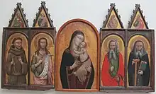 Vierge à l’Enfant entourée d'un saint apôtre, de saint Jean Baptiste, sainte Marie-Madeleine, et saint Bernard; quatre anges (c. 1320), tempera su tavola, 120 × 280 cm, Pistoia, Musée civique (it) (inv. 1975.16).