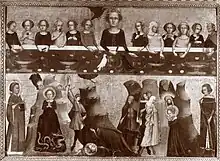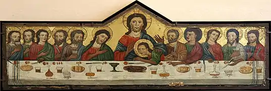 Autre élément remarquable : si l'on se remémore la représentation canonique de la Dernière Cène au Duecento - comme celle du Musée du Petit-Palais en Avignon attribué au Maître de la Madeleine, ce panneau donne le sentiment d'assister à une dernière cène au féminin, illustrant donc au mieux la notion d'imitatio christi[55]. Elle confirme le besoin et le rôle modèle des saintes (comme ici sainte Irène), dans un contexte où l'abandon de la vie séculaire était loin d'être évident pour les femmes[56].