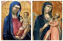L'Enfant aux petits yeux, au nez relevé, au large front dégagé par une calvitie précoce trouve son homologue dans l'Enfant de la Maestà de 1310 ou encore celui du polyptyque de Pistoia[31]. On retrouve surtout ce geste gracieux et tendre de tirer à Lui le voile de la Vierge.