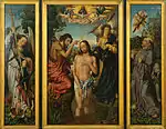 | Note : Baptême du Christ par Jean-Baptiste. Dans un nuage, Dieu le Père, la colombe du Saint-Esprit, et une banderole avec l'inscription latine « Ceci est mon fils... ». Le volet gauche montre saint Michel terrassant le démon, et portant la balance du jugement dernier. Le volet droit contient une représentation de François d'Assise, avec ses stigmates et sa vision du Christ[20]. | ||||