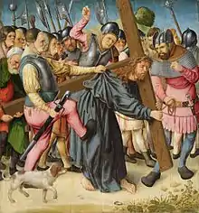 La Montée au calvaire est un tableau conservé dans la Collection des peintures françaises du Musée des Beaux-Arts de Lyon[5]. Plus petit, il montre une foule entassée et mouvementée entourant le Christ portant la croix, tiré par un soldat, recevant un coup de pied d'un autre. Les corps sont plus plats, les couleurs moins raffinées, même si les plis des vêtements sont rendus avec beaucoup de précision. Le tableau a dû être recoupé.