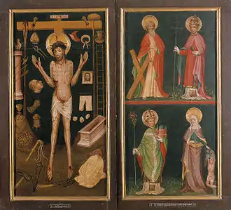 Les volet externes, que l'on voit quand le retable est fermé, montrent à gauche, sur fond noir, le Christ de douleur, entouré des Arma Christi (les instruments de la Passion) en grand nombre, y compris les deniers reçus par Judas, les dés pour le tirage au sort des vêtements, la tête et la main du grand-prêtre qui gifla le Christ. La partie droite représente, dans le registre supérieur, l'apôtre André et un des papes, Urbain, et dans le registre inférieur un saint, peut-être Héribert de Cologne, fondateur de l'abbaye de Deutz, et Élisabeth de Hongrie, bienfaitrice, accompagnée d'un garçon qu'elle habille.