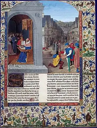 Les décorations marginales sont antérieures, attribuées à l'atelier du Maître de Jouvenel (années 1450). Le Maître collabore avec Jean Bourdichon. Le fol.5 ci-contre (ou son dessin) est généralement attribué à la main de Jean Fouquet lui-même. Le manuscrit est achevé dans le style de Jean Pichore vers 1500[28]. |