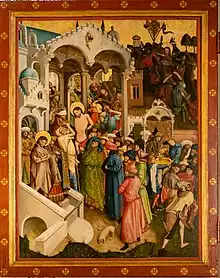 Cette œuvre est datée de 1443[1], ou plus tardivement, vers 1455[8]. Les quatre Pères de l'Église représentés sont à gauche, Grégoire et Jérôme, et à droite Ambroise puis Augustin. Au centre saint Nicolas, à qui était dédié l'autel. Les personnages se détachent sur fond doré, et un soin particulier a été apporté au rendu des luxueux vêtements liturgiques. L'ensemble est richement coloré. Ce tableau est grand (107 × 165 cm), trop grand pour être une prédelle, le tableau a pu servir comme antependium, mais c'était plutôt le panneau central d'un retable dédié à saint Nicolas[8], car d'après Jászai, le monastère de Marienthal-Niesing avait ces saints pour patrons. - Messe de saint Grégoire[9]. Ce tableau date d'environ 1455. De petite taille (48,5 × 29,5 cm), peint sur bois, il représente le pape Grégoire le Grand (540-604) en train de célébrer la messe en l'église Sainte-Croix-de-Jérusalem de Rome, avec en face de lui sur l'autel la vision du Christ en tant qu'Homme de douleur. Il est également au musée LWL d'art et de culture (de) de Münster.