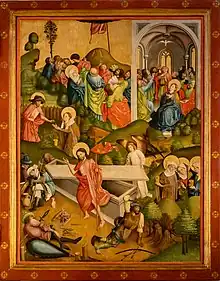 Le tableau est clairement partagé en quatre scènes : la scène centrale du bas représente la résurrection, le Christ levant la main droite en signe de bénédiction et tenant dans la main gauche l'étendard de la résurrection. Les soldats, autour d'un feu en forme de croix, sont endormis, alors qu'à droite les saintes femmes portent des récipients à onguent. Juste au-dessus, à droite, le Christ en jardinier apparaît à Marie Madeleine dans la scène du Noli me tangere. En haut à gauche, l'Ascension du Christ (on ne voit plus que le bas de ses jambes), et en haut à droite la Pentecôte, où le Saint Esprit descend sur l'assemblée des apôtres et de Marie.