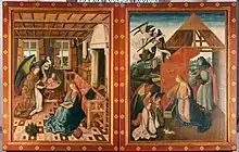 Les deux panneaux visibles lorsque les volets du retable sont fermés montrent à gauche une Annonciation et à droite une Nativité. Les deux images sont liées par des diagonales opposées qui traversent les compositions. Un autre contraste visible réside dans l’intérieur douillet de la chambre où a lieu l’annonciation, dans un ordonnancement proche du Maître de Flémalle, et la nativité où l'enfant gît, comme fréquent à l'époque, nu sur le sol, à l'extérieur, à peine protégé par la grange, adoré par trois anges. Le chœur d'anges annonce la naissance, et le paysage est rendu avec un soin particulier.