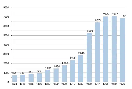 En tenant compte des anciennes communes entraînées dans la fusion de communes de 1977, on peut dresser l'évolution suivante[4] :