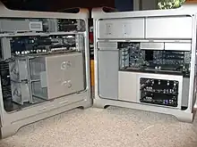 Le Power PC G4, laisse ensuite sa place au PowerPC G5 à partir de 2003[47], où il fait son entrée dans le Power Macintosh G5, puis dans l'iMac en 2004. Trop énergivore et dégageant trop de chaleur, Le G5 ne sera jamais intégré par Apple dans ses ordinateurs portables[48]. En , Apple annonce son Mac mini, le Macintosh le moins cher jamais vendu par la firme, disponible à sa sortie pour 499 dollars/529 euros[49]. Après la sortie de Mac OS 8, le système a continué d'évoluer jusqu'à sa dernière version, la 9.2.2. Parmi les améliorations apportées se trouve le support du système de fichiers HFS+ dans la version 8.1, la restriction aux processeurs PowerPC dans la version 8.5 et l'apparition du nano-kernel dans la version 8.6[50],[51]. Le projet Copland ayant été abandonné, Apple avait racheté, en , NeXT pour faire du système d'exploitation NeXTSTEP la base du nouveau système d'exploitation des Macintosh, Mac OS X. Ce dernier est fondé sur le micro-noyau Mach implanté dans le noyau XNU, tous les deux utilisés par NeXTSTEP, et améliorés à partir du code issu de BSD pour être inclus dans le cœur de Mac OS X, Darwin. La première version bêta publique sort en . Vendue 30 dollars, elle permet d'avoir un aperçu du nouveau système et de pouvoir rapporter les bugs rencontrés[52]. La première version de Mac OS X, 10.0 (nom de code Cheetah), est quant à elle disponible à partir du . Elle contient l'environnement Classic, qui permet de faire fonctionner les applications conçues pour les versions antérieures de Mac OS. Par la suite, Apple publie des mises à jour majeures pour son système d'exploitation : 10.1 Puma (), 10.2 Jaguar (), 10.3 Panther (), 10.4 Tiger (), 10.5 Leopard (), 10.6 Snow Leopard (), 10.7 Lion (), 10.8 Mountain Lion (), 10.9 Mavericks (), 10.10 Yosemite (), 10.11 El Capitan (), 10.12 Sierra (), 10.13 High Sierra (), 10.14 Mojave (), 10.15 Catalina () et la dernière en date 11.0 Big Sur ().