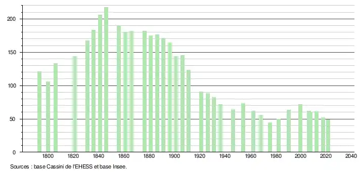 L'évolution du nombre d'habitants est connue à travers les recensements de la population effectués dans la commune depuis 1793. Pour les communes de moins de 10 000 habitants, une enquête de recensement portant sur toute la population est réalisée tous les cinq ans, les populations légales des années intermédiaires étant quant à elles estimées par interpolation ou extrapolation[18]. Pour la commune, le premier recensement exhaustif entrant dans le cadre du nouveau dispositif a été réalisé en 2007[19].