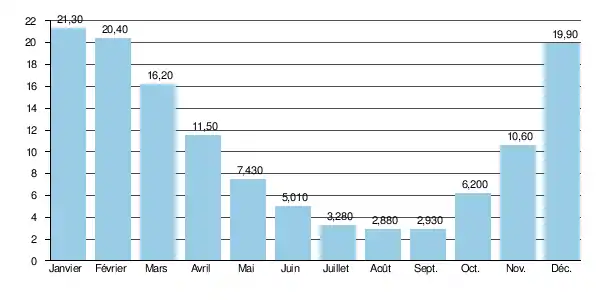 Le débit instantané maximal enregistré à la station a été de 273 m3/s le , tandis que la valeur journalière maximale était de 227 m3/s le [2]. En comparant la première de ces valeurs à l'échelle des QIX de la rivière, il ressort que cette crue d' n'était même pas vicennale, et donc pas du tout exceptionnelle.
