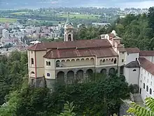 Depuis le contrebas, on accède au sanctuaire par deux chemin partant de la Via al Sasso. C'est ici que se trouve l'église de l'Annonciation, sa sacristie ainsi que le mausolée du frère Bartolomeo Piatti. L'un des chemins devient ensuite un chemin de croix composé de quatorze stations protégées par de petites chapelles. Arrivé au sommet, le chemin de croix passe par un tunnel présent dans le mur de soutènement afin d'arriver au monastère et au musée ainsi qu'à l'église Sainte Marie de l'Assomption[1].