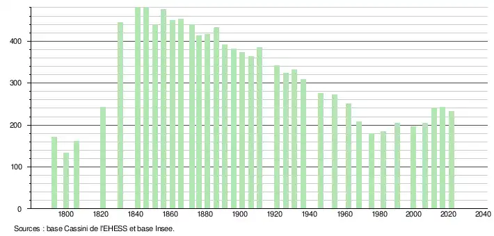 L'évolution du nombre d'habitants est connue à travers les recensements de la population effectués dans la commune depuis 1793. Pour les communes de moins de 10 000 habitants, une enquête de recensement portant sur toute la population est réalisée tous les cinq ans, les populations légales des années intermédiaires étant quant à elles estimées par interpolation ou extrapolation[28]. Pour la commune, le premier recensement exhaustif entrant dans le cadre du nouveau dispositif a été réalisé en 2006[29].