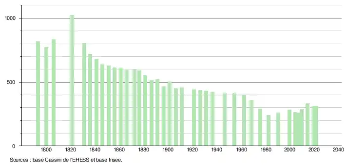 L'évolution du nombre d'habitants est connue à travers les recensements de la population effectués dans la commune depuis 1793. Pour les communes de moins de 10 000 habitants, une enquête de recensement portant sur toute la population est réalisée tous les cinq ans, les populations légales des années intermédiaires étant quant à elles estimées par interpolation ou extrapolation[25]. Pour la commune, le premier recensement exhaustif entrant dans le cadre du nouveau dispositif a été réalisé en 2004[26].
