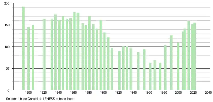 L'évolution du nombre d'habitants est connue à travers les recensements de la population effectués dans la commune depuis 1793. Pour les communes de moins de 10 000 habitants, une enquête de recensement portant sur toute la population est réalisée tous les cinq ans, les populations légales des années intermédiaires étant quant à elles estimées par interpolation ou extrapolation[24]. Pour la commune, le premier recensement exhaustif entrant dans le cadre du nouveau dispositif a été réalisé en 2008[25].