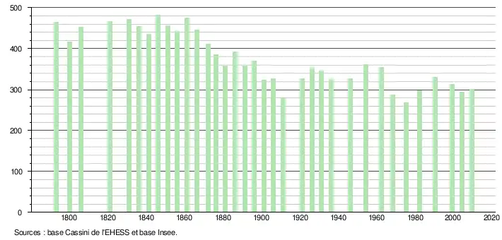 L'évolution du nombre d'habitants est connue à travers les recensements de la population effectués dans la commune depuis 1793. À partir du , les populations légales des communes sont publiées annuellement dans le cadre d'un recensement qui repose désormais sur une collecte d'information annuelle, concernant successivement tous les territoires communaux au cours d'une période de cinq ans. Pour les communes de moins de 10 000 habitants, une enquête de recensement portant sur toute la population est réalisée tous les cinq ans, les populations légales des années intermédiaires étant quant à elles estimées par interpolation ou extrapolation[16]. Pour la commune, le premier recensement exhaustif entrant dans le cadre du nouveau dispositif a été réalisé en 2004[17],[Note 2].