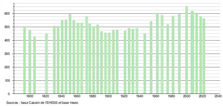 L'évolution du nombre d'habitants est connue à travers les recensements de la population effectués dans la commune depuis 1793. Pour les communes de moins de 10 000 habitants, une enquête de recensement portant sur toute la population est réalisée tous les cinq ans, les populations légales des années intermédiaires étant quant à elles estimées par interpolation ou extrapolation[24]. Pour la commune, le premier recensement exhaustif entrant dans le cadre du nouveau dispositif a été réalisé en 2007[25].