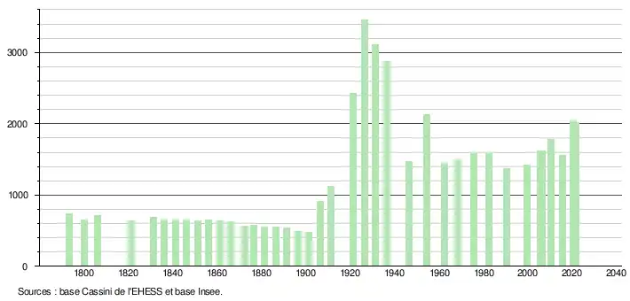 L'évolution du nombre d'habitants est connue à travers les recensements de la population effectués dans la commune depuis 1793. Pour les communes de moins de 10 000 habitants, une enquête de recensement portant sur toute la population est réalisée tous les cinq ans, les populations légales des années intermédiaires étant quant à elles estimées par interpolation ou extrapolation[18]. Pour la commune, le premier recensement exhaustif entrant dans le cadre du nouveau dispositif a été réalisé en 2005[19].