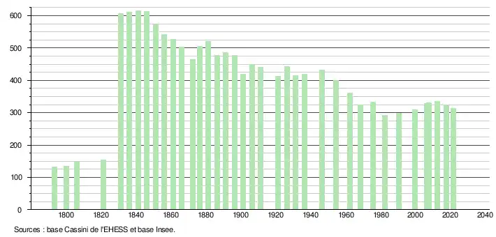 L'évolution du nombre d'habitants est connue à travers les recensements de la population effectués dans la commune depuis 1793. Pour les communes de moins de 10 000 habitants, une enquête de recensement portant sur toute la population est réalisée tous les cinq ans, les populations légales des années intermédiaires étant quant à elles estimées par interpolation ou extrapolation[22]. Pour la commune, le premier recensement exhaustif entrant dans le cadre du nouveau dispositif a été réalisé en 2007[23].