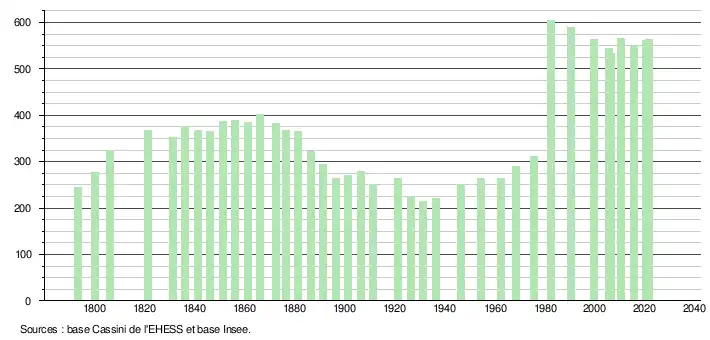 L'évolution du nombre d'habitants est connue à travers les recensements de la population effectués dans la commune depuis 1793. Pour les communes de moins de 10 000 habitants, une enquête de recensement portant sur toute la population est réalisée tous les cinq ans, les populations légales des années intermédiaires étant quant à elles estimées par interpolation ou extrapolation[27]. Pour la commune, le premier recensement exhaustif entrant dans le cadre du nouveau dispositif a été réalisé en 2005[28].