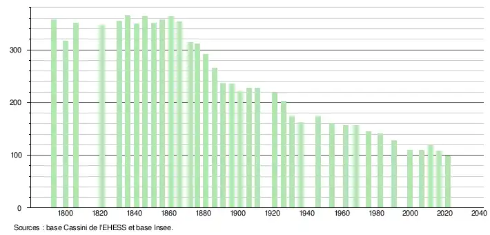 L'évolution du nombre d'habitants est connue à travers les recensements de la population effectués dans la commune depuis 1793. Pour les communes de moins de 10 000 habitants, une enquête de recensement portant sur toute la population est réalisée tous les cinq ans, les populations légales des années intermédiaires étant quant à elles estimées par interpolation ou extrapolation[18]. Pour la commune, le premier recensement exhaustif entrant dans le cadre du nouveau dispositif a été réalisé en 2006[19].