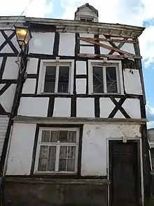 La façade est élevée en colombages et torchis chaulé avec ossature en pans-de-bois dont deux croix de saint André. Ce modeste immeuble possède deux travées et deux niveaux (un étage). Le pignon possède un soubassement en moellons de grès[3].