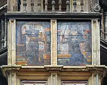 Les peintures qui décorent les façades, attribuées à Christian Vacksterffer, représentent les empereurs germaniques du XVIe siècle (médaillons en bas-reliefs peints[4]), des blasons (l'Empire, Colmar, la Haute-Alsace[4]), les Quatre Évangélistes, les pères de l'Église d'Occident, des scènes de la Genèse et des figures allégoriques[3] telles que la Foi (Glaube) et la Justice (Gerechtigkeit)[9].