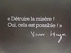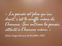 « Victor Hugo est né dans cette maison le 26 février 1802. Cette dédicace dévoilée le 25 février 2002 rappelle au XXIe siècle l'actualité des idéaux et des combats politiques du plus célèbre écrivain de France. Je veux les peuples grands, je veux les hommes libres. »