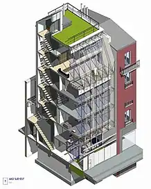 Dès la conception du projet, l’architecte a mis en œuvre une démarche BIM (Building Information Modeling)[6] afin d’anticiper l’ensemble des problématiques spatiales et constructives du bâtiment. La maquette numérique s’est ainsi révélée très précise et apte à nouer un dialogue constructif entre les commanditaires, l’architecte et le constructeur[7].