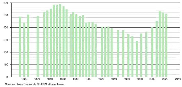 L'évolution du nombre d'habitants est connue à travers les recensements de la population effectués dans la commune depuis 1793. Pour les communes de moins de 10 000 habitants, une enquête de recensement portant sur toute la population est réalisée tous les cinq ans, les populations légales des années intermédiaires étant quant à elles estimées par interpolation ou extrapolation[23]. Pour la commune, le premier recensement exhaustif entrant dans le cadre du nouveau dispositif a été réalisé en 2006[24].