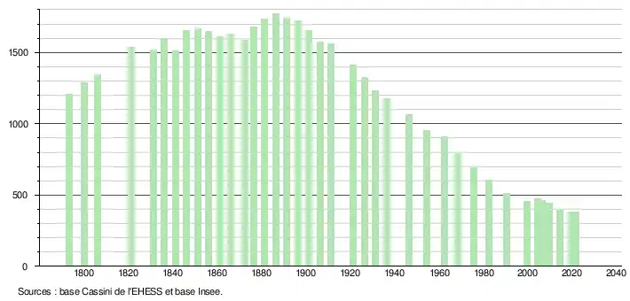 L'évolution du nombre d'habitants est connue à travers les recensements de la population effectués dans la commune depuis 1793. Pour les communes de moins de 10 000 habitants, une enquête de recensement portant sur toute la population est réalisée tous les cinq ans, les populations légales des années intermédiaires étant quant à elles estimées par interpolation ou extrapolation[22]. Pour la commune, le premier recensement exhaustif entrant dans le cadre du nouveau dispositif a été réalisé en 2004[23].