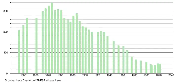 L'évolution du nombre d'habitants est connue à travers les recensements de la population effectués dans la commune depuis 1793. Pour les communes de moins de 10 000 habitants, une enquête de recensement portant sur toute la population est réalisée tous les cinq ans, les populations légales des années intermédiaires étant quant à elles estimées par interpolation ou extrapolation[28]. Pour la commune, le premier recensement exhaustif entrant dans le cadre du nouveau dispositif a été réalisé en 2008[29].