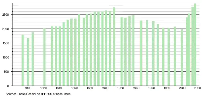 L'évolution du nombre d'habitants est connue à travers les recensements de la population effectués dans la commune depuis 1793. Pour les communes de moins de 10 000 habitants, une enquête de recensement portant sur toute la population est réalisée tous les cinq ans, les populations légales des années intermédiaires étant quant à elles estimées par interpolation ou extrapolation[16]. Pour la commune, le premier recensement exhaustif entrant dans le cadre du nouveau dispositif a été réalisé en 2008[17].