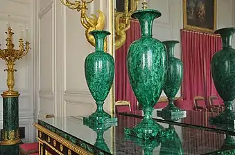 - Dans le « Salon des malachites » au château du Grand Trianon à Versailles. Cette pièce, devenue « Salon de l'Empereur » sous Napoléon 1er, contient en particulier les objets d'art (candélabres, vases, vasque) fabriqués avec les blocs de malachite de Sibérie, offerts par le tsar Alexandre Ier de Russie à Napoléon Ier, en 1808, après la signature du traité de Tilsitt, le .