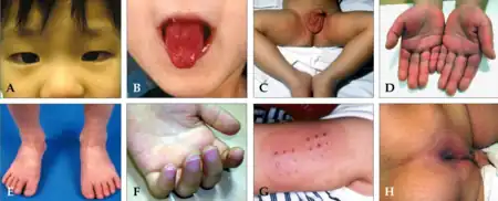 - l'atteinte des extrémités est très caractéristique de la maladie : érythème à la paume des mains et à la plante des pieds, suivi d'un œdème induré de la face dorsale des mains et des pieds. Les ongles peuvent prendre une coloration orange-brun entre le 5e et 8e jour de fièvre[9]. Une desquamation de la pulpe des doigts et des orteils, et autour des ongles, apparaît vers la 2e ou 3e semaine d'évolution.