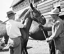 La maladie naviculaire, ou syndrome naviculaire, est une affection inflammatoire touchant l'os naviculaire des pieds antérieurs des chevaux adultes. Si elle touche en général les deux pieds, cette maladie entraînant une boiterie peut être asymétrique (ne toucher qu'un seul pied) ou alternative (touche un pied, puis l'autre)[3]. Les premiers symptômes (allures rétrécies) ne sont pas évidents et il faut souvent une radiographie pour établir un diagnostic clair. Il existe des soins pour tenter d'enrayer cette maladie irréversible et soulager le cheval, mais pas pour la guérir. Il pourra par exemple être prescrit du Tildren, un médicament à base d'acide tiludronique, indiqué dans le traitement de cette maladie, une ferrure orthopédique, une adaptation du travail de l'animal sur des sols souples et, en dernier recours, une névrectomie[5] susceptible de laisser des effets secondaires.