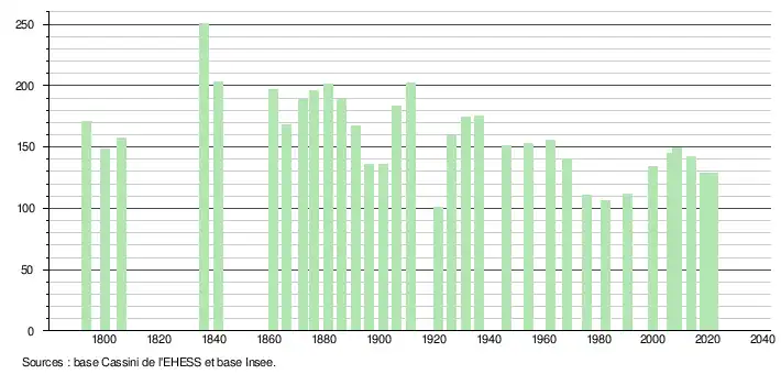 L'évolution du nombre d'habitants est connue à travers les recensements de la population effectués dans la commune depuis 1793. Pour les communes de moins de 10 000 habitants, une enquête de recensement portant sur toute la population est réalisée tous les cinq ans, les populations légales des années intermédiaires étant quant à elles estimées par interpolation ou extrapolation[17]. Pour la commune, le premier recensement exhaustif entrant dans le cadre du nouveau dispositif a été réalisé en 2008[18].
