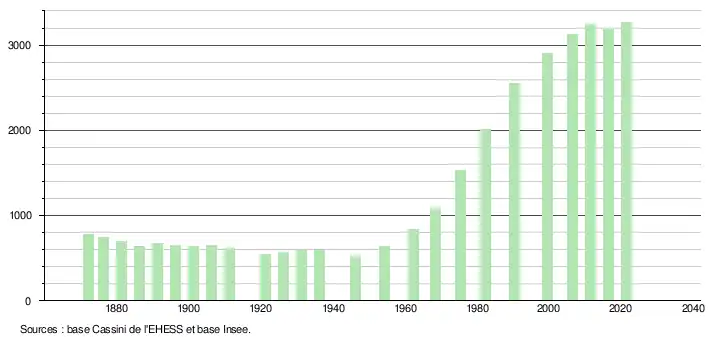 L'évolution du nombre d'habitants est connue à travers les recensements de la population effectués dans la commune depuis 1872. Pour les communes de moins de 10 000 habitants, une enquête de recensement portant sur toute la population est réalisée tous les cinq ans, les populations légales des années intermédiaires étant quant à elles estimées par interpolation ou extrapolation[19]. Pour la commune, le premier recensement exhaustif entrant dans le cadre du nouveau dispositif a été réalisé en 2006[20].