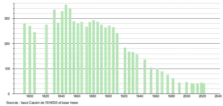 L'évolution du nombre d'habitants est connue à travers les recensements de la population effectués dans la commune depuis 1793. Pour les communes de moins de 10 000 habitants, une enquête de recensement portant sur toute la population est réalisée tous les cinq ans, les populations légales des années intermédiaires étant quant à elles estimées par interpolation ou extrapolation[27]. Pour la commune, le premier recensement exhaustif entrant dans le cadre du nouveau dispositif a été réalisé en 2008[28].