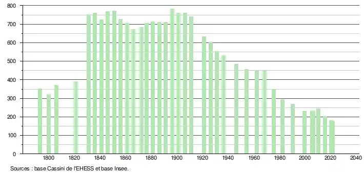 L'évolution du nombre d'habitants est connue à travers les recensements de la population effectués dans la commune depuis 1793. Pour les communes de moins de 10 000 habitants, une enquête de recensement portant sur toute la population est réalisée tous les cinq ans, les populations légales des années intermédiaires étant quant à elles estimées par interpolation ou extrapolation[20]. Pour la commune, le premier recensement exhaustif entrant dans le cadre du nouveau dispositif a été réalisé en 2005[21].