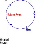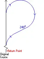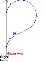 - On amorce alors la manœuvre proprement dite avec un angle de barre typique de 15° pour faire venir le navire à 60° ou 70° du cap initial. Une fois arrivé à ce cap, il faut mettre de la barre à contre (15° de l'autre bord), lorsque vous approchez le cap inverse à 20°, mettre la barre à zéro puis adopter le cap inverse du cap initial. Dans le cas d'un signalement très tardif d'une chute ou d'une suspicion de chute à la mer, le bord d'amorçage du demi-tour n'a aucune importance puisque l'allure machine ne sera pas réduite. S'il s'agit d'une manœuvre de récupération immédiate, il vaut mieux l'amorcer du côté sous le vent et remonter nez dans le vent tout en commençant à réduire l'allure. En effet, la force vélique nous aidera à virer et à ralentir, ce qui n'est pas vrai dans l'autre sens.