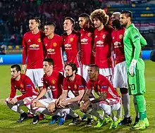 La première saison de José Mourinho comme entraîneur du club est réussie au niveau des titres remportés avec un triplé. En effet les mancuniens glanent tout d'abord le Community Shield, contre le champion en titre Leicester, sur le score de 2-1[34], la Coupe de la Ligue face à Southampton 3-2[35], et surtout la Ligue Europa, en battant en finale l'Ajax Amsterdam, sur le score de 2-0[36], faisant des Red Devils le cinquième club à remporter les trois compétitions européennes, à savoir la Ligue des Champions, la Coupe des Coupes et la Ligue Europa, après la Juventus en 1985, l'Ajax Amsterdam et le Bayern Munich en 1996, puis Chelsea en 2013[37]. Les Mancuniens retrouvent donc la Ligue des champions et se qualifient pour la Supercoupe de l'UEFA. Durant le mercato estival, les Red Devils ont acheté le défenseur ivoirien Éric Bailly[38] (Villarreal, 38 M€), l'attaquant suédois Zlatan Ibrahimović[39] en fin de contrat avec le Paris Saint-Germain, le milieu de terrain Henrikh Mkhitaryan[40] (Borussia Dortmund, 40 M€) et officialisé le retour de l'international français Paul Pogba pour la somme record de 105 M€ (+5 M€ bonus) en provenance de la Juventus.