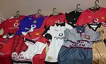 Les tenues extérieures sont généralement blanches avec des shorts noirs et chaussettes blanches[59], mais d'autres couleurs sont utilisées, y compris un bleu et blanc rayé de 1903 à 1916, un autre noire en 1994 et 2003, et une tenue bleue et argent en 2000. L'une des plus célèbres, mais de courte durée, est de loin la grise utilisée en 1995-1996, qui est abandonnée après l'échec de l'équipe à remporter un seul match avec. À la mi-temps pendant un match contre Southampton, quand United en est déjà à un score défavorable de 3-0, ils ont mis leur troisième maillot bleu et blanc, mais ont finalement perdu 3-1. Selon les joueurs, le gris n'est pas assez visible, ce qui a conduit à la faiblesse des résultats[61]. Un autre fameux maillot de Manchester United est un réversible blanc avec des manches noires et des garnitures en or d'un côté et de l'or avec des garnitures noires de l'autre. Ce maillot est le dernier créé par Umbro pour le club avant le changement avec Nike. Il sert à célébrer les 100 ans du club sous le nom de Manchester United.