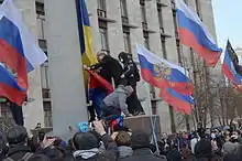 Manifestants pro-russes retirant un drapeau ukrainien d'un édifice, oblast de Donetsk, .