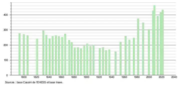 L'évolution du nombre d'habitants est connue à travers les recensements de la population effectués dans la commune depuis 1793. Pour les communes de moins de 10 000 habitants, une enquête de recensement portant sur toute la population est réalisée tous les cinq ans, les populations légales des années intermédiaires étant quant à elles estimées par interpolation ou extrapolation[21]. Pour la commune, le premier recensement exhaustif entrant dans le cadre du nouveau dispositif a été réalisé en 2008[22].